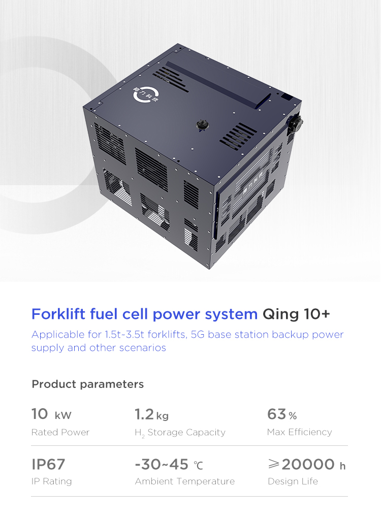 The forklift fuel cell system independently developed by Beijing Wltech can be customized. It adopts modular design with low maintenance cost, strong environmental adaptability, low noise, high reliability, high stability and other characteristics. Refilling hydrogen in 3 minutes, working for 4-6 hours, zero pollution and zero emission, and meets the requirements of “carbon peaking and carbon neutrality".