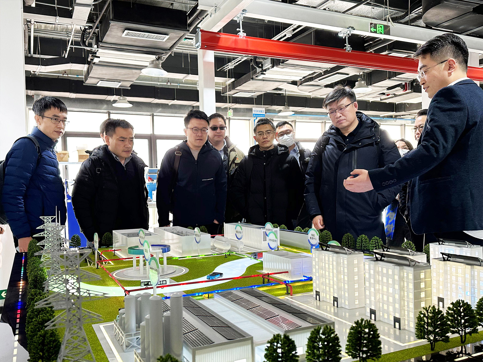 考察期間,通過現場的(de)解決方案沙盤模型演示,新航城考察組一(yī)行直觀了解了“光制儲氫及應用一(yī)體化”項目的(de)氫電耦合運行模式,以及北京穩力自(zì)主研發的(de)“分布式綜合能源系統”,單模塊額定功率500kW,支持定制、多模塊擴展、多能源耦合,氫電轉換效率高(gāo),熱電聯産效率>90%,同時,通過氫能支撐的(de)智能直流微網,滿足用戶的(de)“電、熱、冷、氣、水”多種用能需求。
